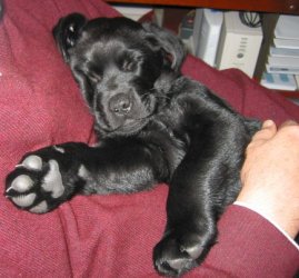 Like all puppies, he's good at sleeping anywhere, anytime. We have lots of dog beds, and the comfort of Rex's arms.