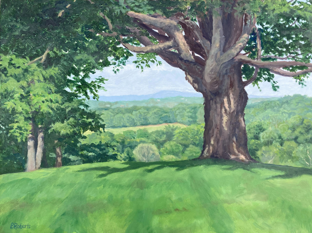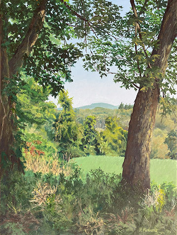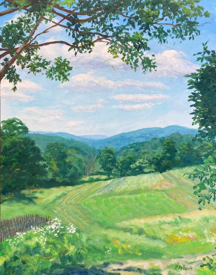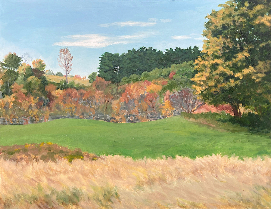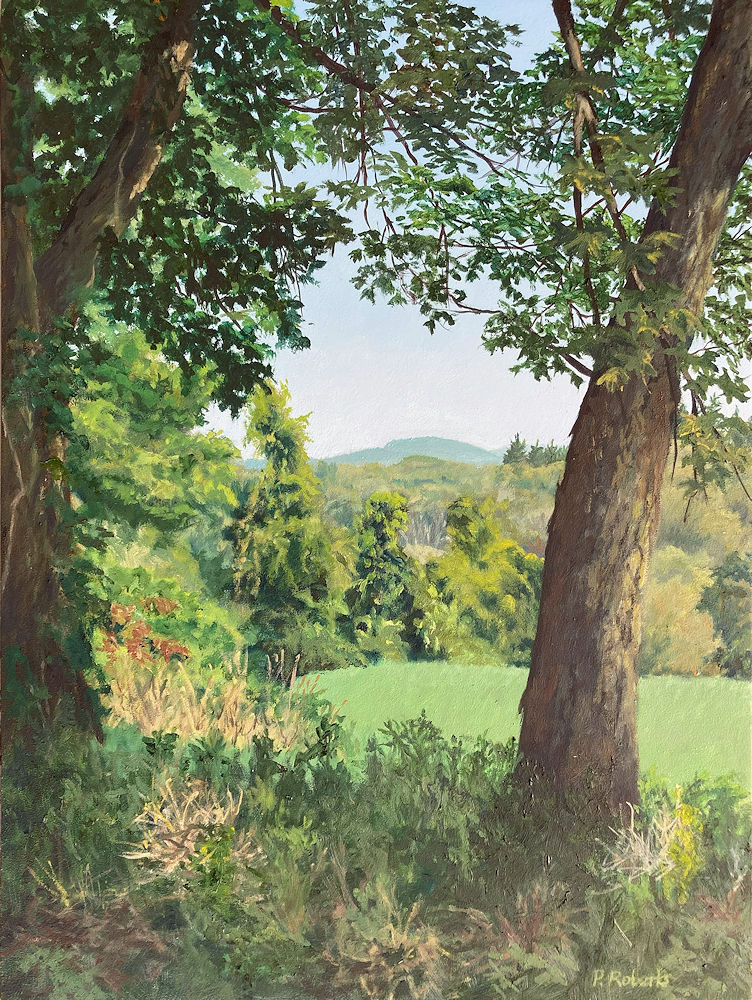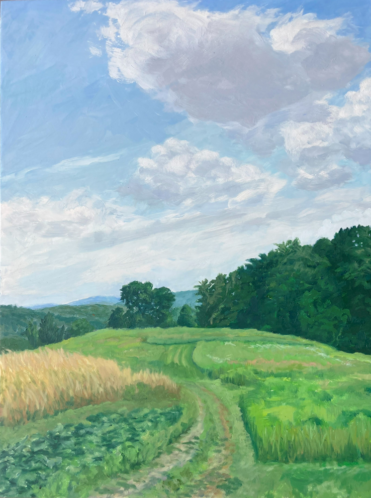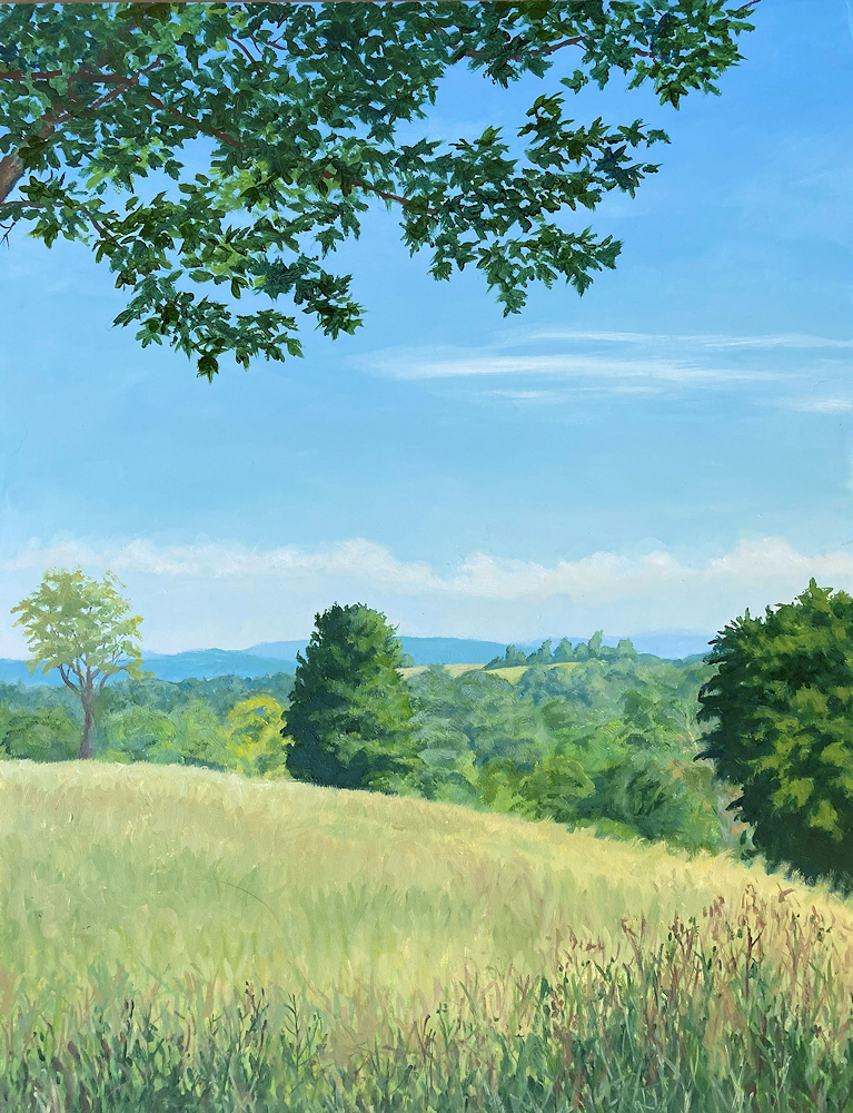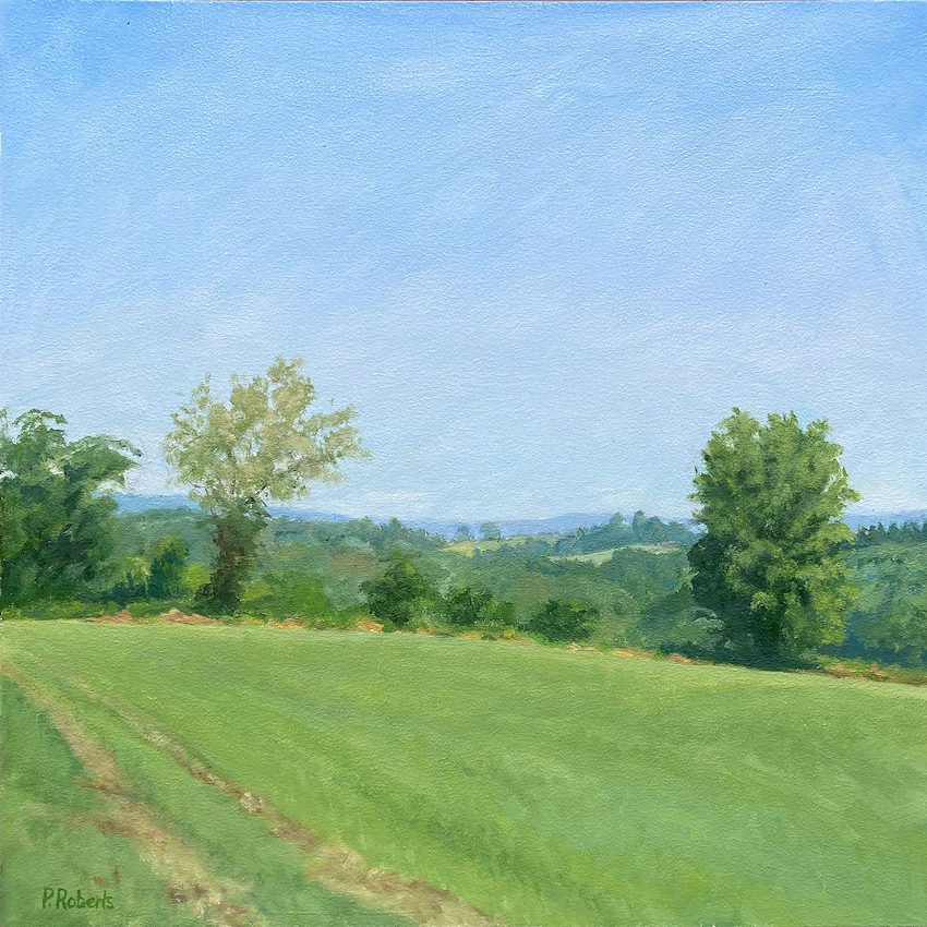 Painting with oils on either panel or Arches cotton paper, I work on-site (en plein air), trying to convey the quality of light and space. This is both fun and frustrating, since the light constantly changes and shifts, not only by the minute, but from day to day, with temperature and humidity. And when the light shifts, the way you see space and distance changes, so it's a race to capture the essence of the scene.I love sitting in a field hearing the bugs and birds going about their business. And I'm lucky enough to live in a place where there's open land that probably hasn't changed much in generations.